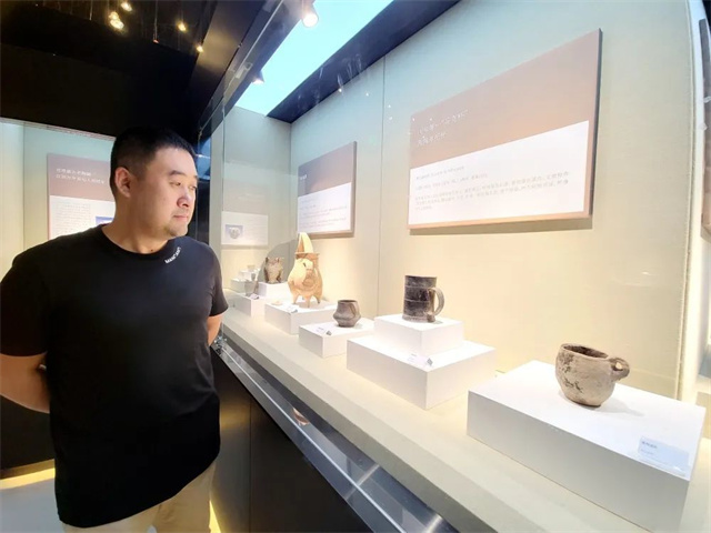 “你看,我非常喜歡這個杯子。我國在新石器時期出現(xiàn)了陶器,其中龍山文化的黑陶蛋殼杯體現(xiàn)了這一時期陶器制作的最高水平,這個黑陶蛋殼杯來自于4500年前咱們山東的龍山文化,由于器型與馬克杯極其相似,又被譽為‘中華第一馬克杯’,杯壁最薄處只有0.2-0.3毫米,重量為210克,拿在手中輕若無物。”王曉波對展廳內(nèi)的杯子如數(shù)家珍,每一個杯子背后的故事和當(dāng)初獲得時的喜悅之情都讓他記憶猶新。