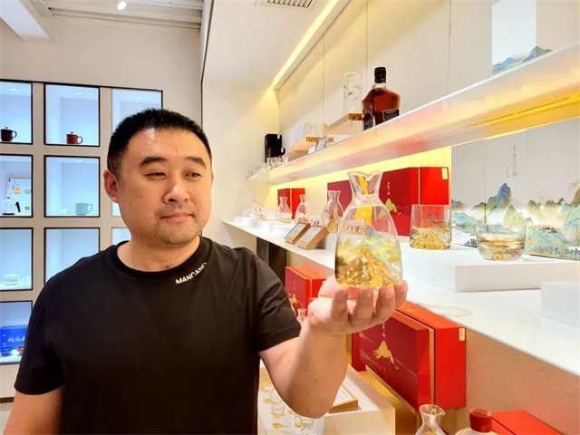 故宮是文創(chuàng)界的頂流IP,近期在故宮博物院文創(chuàng)旗艦店新上線了兩款精美杯子——“千里江山”炫彩玻璃杯和酒具套裝。杯底的金色山峰層巒疊嶂,意境悠遠(yuǎn)。這款杯子是由王曉波帶領(lǐng)團(tuán)隊設(shè)計制作的。