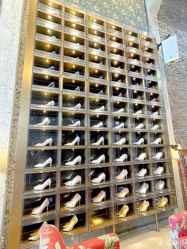 記者獲悉,館內(nèi)除了擺設(shè)了哈維夫婦歷年來(lái)的作品外,還有一個(gè)大型的玻璃鞋柜,里面擺放著多雙不同風(fēng)格類型的高跟鞋。“王倍林原來(lái)是一名從事了二十多年鞋類行業(yè)的工作者,多年來(lái)她設(shè)計(jì)了多款婚鞋,她希望能將婚鞋元素融入到博物館里,因此我們也從過(guò)往設(shè)計(jì)過(guò)的鞋子中,選擇了跟高9.5厘米且最有代表性的高跟鞋,放在了架子上。”工作人員回答道。
