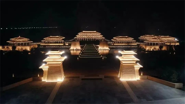 秦漢館以北斗七星中的搖光、開陽、玉衡、天權(quán)、天璣五星組成對(duì)稱布局,整體建筑既有中軸對(duì)稱的恢弘大氣,又兼具不對(duì)稱布局的自由氣息,豪放古拙、剛健質(zhì)樸的“大秦風(fēng)”,給人以獨(dú)特的視覺感受和心靈震撼。