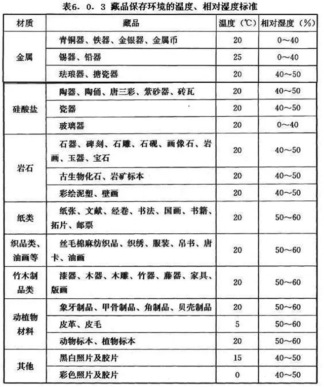 3、設(shè)置空氣調(diào)節(jié)設(shè)備的藏品庫(kù)房、展廳,其溫度和相對(duì)濕度應(yīng)保持穩(wěn)定,溫度日較差應(yīng)控制在2℃~5℃范圍,相對(duì)濕度日波動(dòng)值不應(yīng)高于5%,且應(yīng)根據(jù)藏品材質(zhì)類別確定。藏品保存環(huán)境的溫度、相對(duì)濕度標(biāo)準(zhǔn)可按表6.0.3確定,并應(yīng)滿足工藝要求。