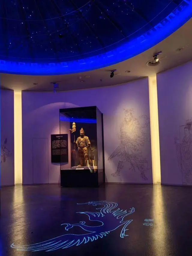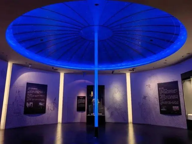 傘與文化來到傘與文化區(qū)域,一把亮藍色的大傘映入眼簾,頂部利用穹頂投影技術展示傘面形狀及構造,28根傘骨對應著28個星宿,中間一道落地光束象征著傘柄,在地面采用人體感應技術,呈現(xiàn)閃爍的星宿圖案。