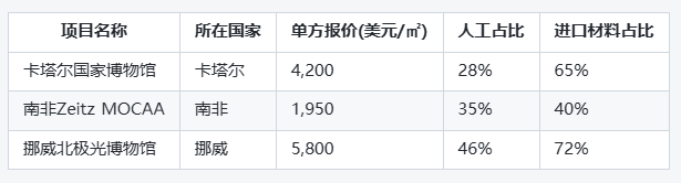 五、政策環(huán)境與隱性成本的影響 1. 行政審批效率與尋租成本 在迪拜,博物館項目可通過“黃金簽證”通道快速獲得施工許可,全程不超過30天;而巴西里約熱內(nèi)盧的歷史建筑改造審批平均耗時8個月,期間產(chǎn)生的貸款利息、場地租賃費等間接成本可達(dá)總投資的5%-7%。某些地區(qū)還存在非正式的“加急費”現(xiàn)象,進一步扭曲報價構(gòu)成。