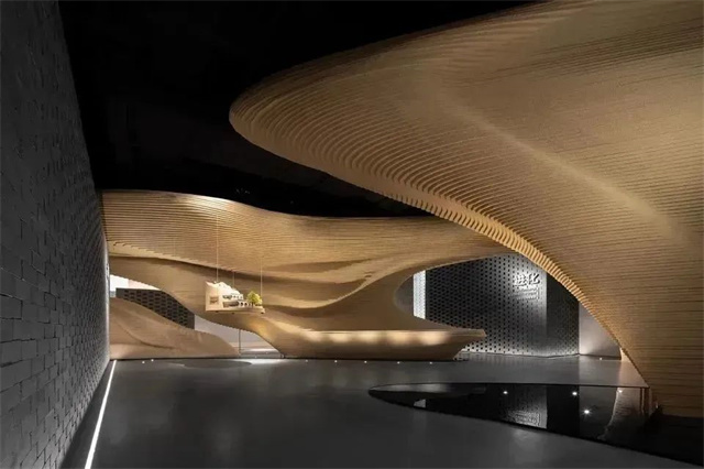 土質(zhì)異形將陜西的地貌、窯洞的洞穴感、未來的流線感進(jìn)行融合,一端追溯著被動(dòng)房的始源——窯洞,另一端從墻體掙脫而出,在空間中舞動(dòng),表達(dá)著古代與未來的對(duì)話。